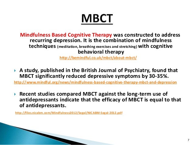 Mindfulness-based cognitive therapy (MBCT) is a new group-based achieved by training them to develop mindfulness via formal mindfulness meditation practice, body scanning techniques and mindful movement training. As the programme ... Access Doc